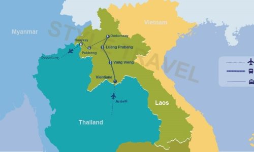 Comienza su viaje en el aeropuerto de Vientiane, la capital de Laos, una encantadora ciudad repleta de villas y bulevares. Dedica uno o dos días a explorar sus atracciones. Luego, toma un tren expreso hacia Vang Vieng, donde podrás participar en diversas actividades, como kayak y trekking. Finalmente, diríjase en tren expreso a Luang Prabang, un sitio declarado Patrimonio de la Humanidad por la UNESCO, conocido por su bien conservado núcleo histórico.
